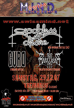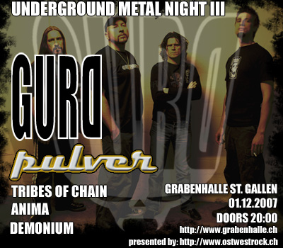 Am 01.12.2007 rocken wir ST.Gallens GRABENHALLE. Auserdem findet die lang erwartete erste PULVER (Vox:Inga Pulver, Git:V.O. Pulver (GurD), Bass:Franky (GurD), Drums:Norman (Fear my Thoughts) Show statt und es sind ein haufen anderer cooler Bands mit am Start. DON'T MISS IT!!!